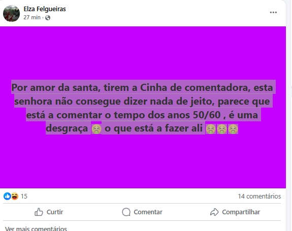 Entre os inúmeros desabafos partilhados nas plataformas digitais, destaca-se a mensagem de um telespectador que rapidamente se tornou viral: “Por amor da santa, tirem a Cinha de comentadora, esta senhora não consegue dizer nada de jeito, parece que está a comentar o tempo dos anos 50/60, é uma desgraça. O que está a fazer ali?” O comentário, carregado de frustração, reflete o sentimento de muitos seguidores do programa, que se mostram cansados do estilo de análise da comentadora.